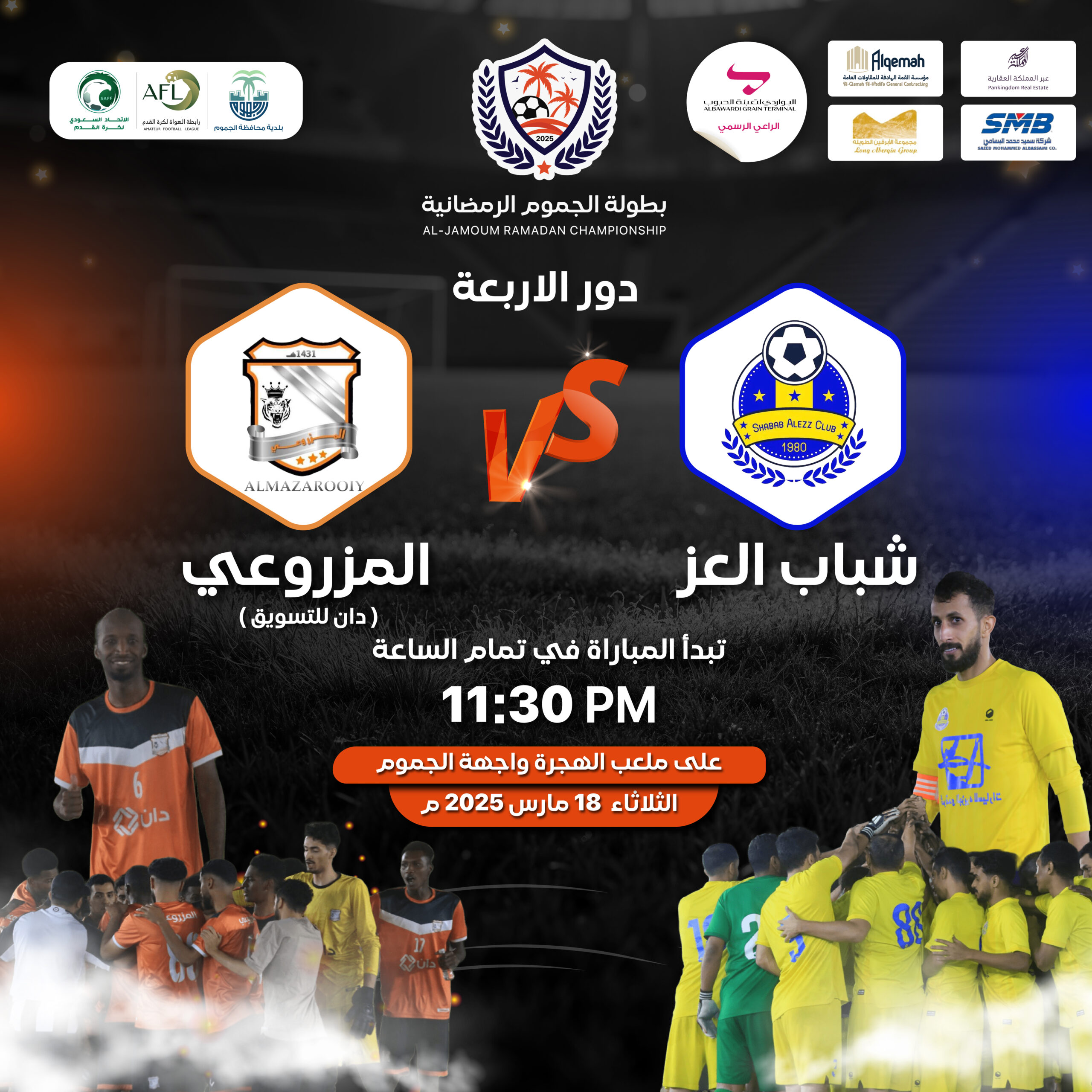 في ليلة رمضانية مشحونة بالحماس والإثارة، تتجه أنظار عشاق كرة القدم إلى ملعب واجهة الجموم لمتابعة واحدة من أقوى مواجهات بطولة الجموم الرمضانية الكبرى. مباراة لا تقبل القسمة على اثنين، ستجمع بين فريق المزروعي من الجموم وشباب العز من مكة في صراع شرس لحجز بطاقة العبور إلى النهائي المرتقب.